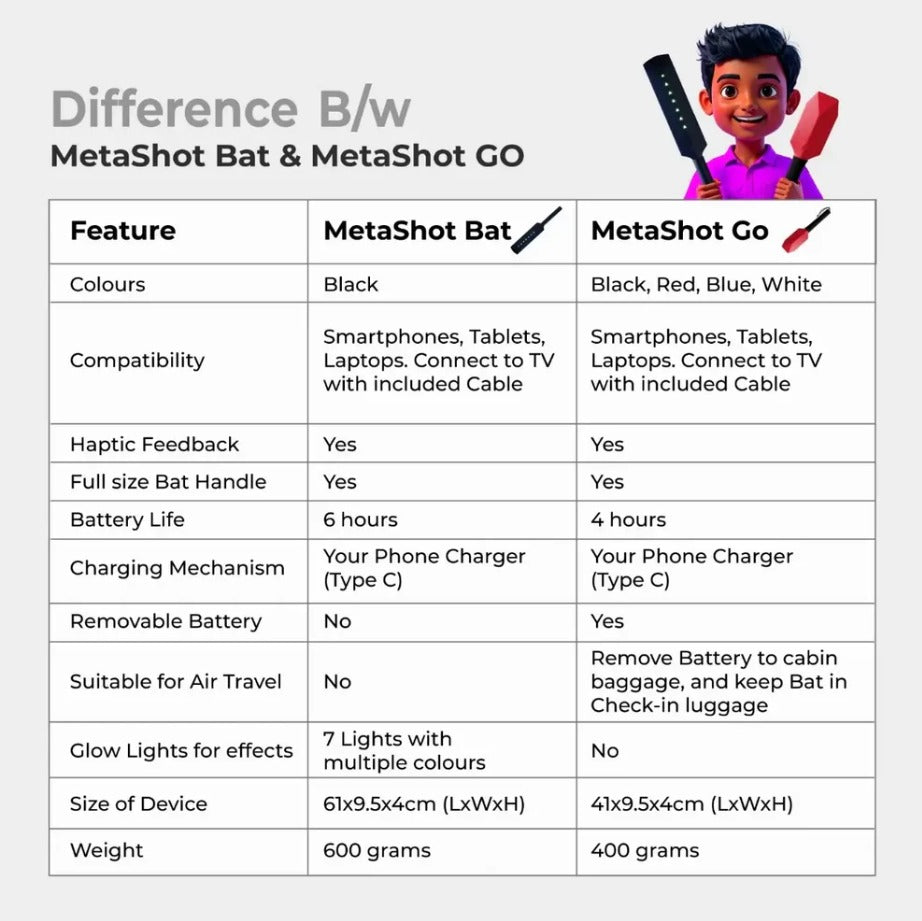 Simply download the free Metashot Go app on your smartphone, tablet, or PC, connect the Smart Bat via Bluetooth, and you’re ready to play. Swing away and start smashing boundaries right from your living room.