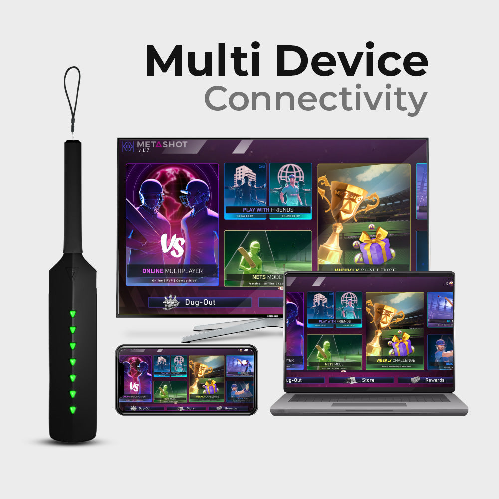 Now you can play Cricket in your living room too. With advanced sensors and your control, the Meta Shot Smart Bat tracks your cricket shots, allowing you to replicate them in the game. Just download the game app for free to your Smartphone/Tablet/PC from the respective App store and connect to the Smart Bat over Bluetooth. Now you are ready to start hitting the boundaries.