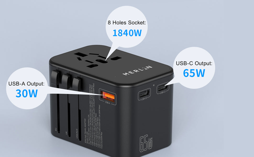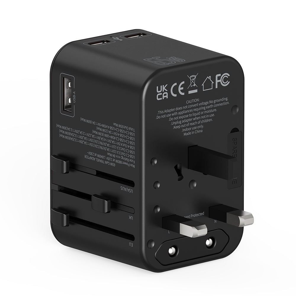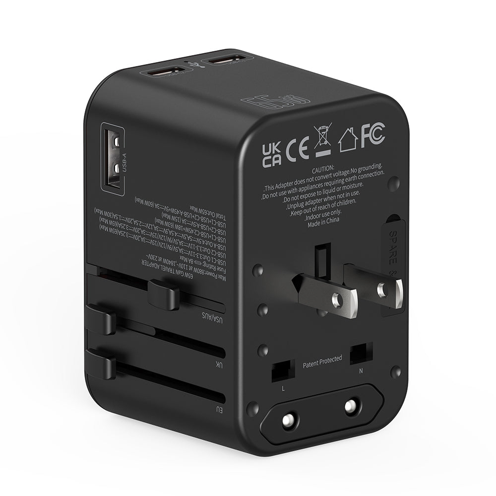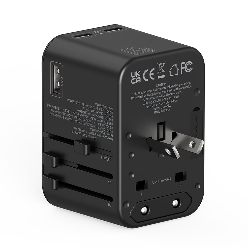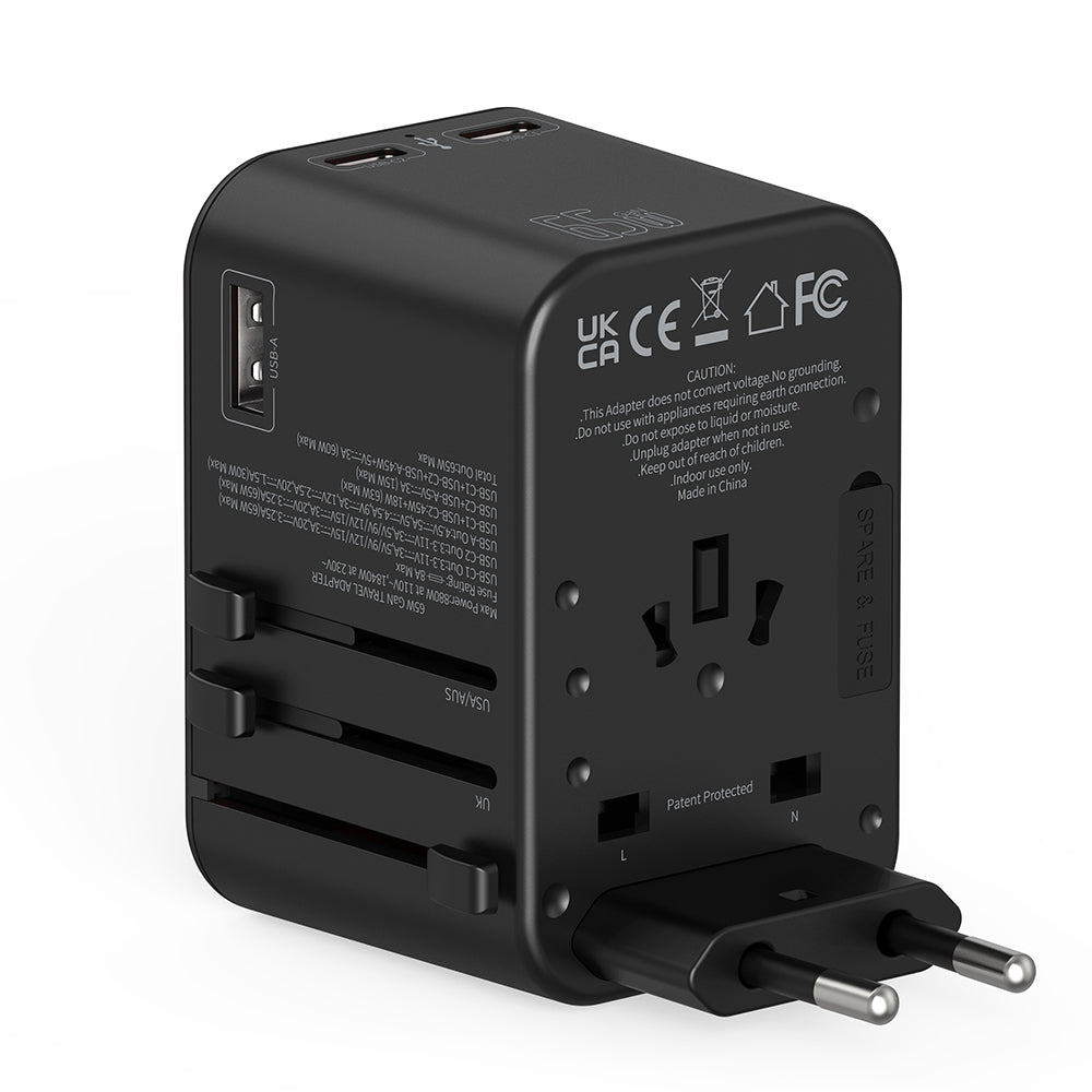 Travel Mate Pro 65W PD GaN Technology Adapter in high power support, quick charging for mobile phones and Laptops, High quality PC fire proof material, 3X Faster than standard charging, Suitable for latest Apple Devices, Over Voltage Protection, High Temperature Resistant, Short Circuit protection, Compatible in over 150 countries, quick charge for USB-C laptops, Trusted at 30,000 feet, 2 High Quality Fuse Tubes Built-In and Super Fast Charge for up to 4 devices at the same time.